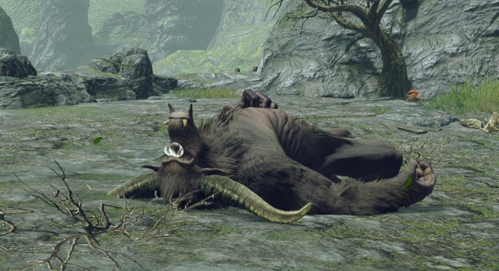 Von dieser unbekannten Bestie geht also eine Bedrohung aus, die zwar noch nicht akut ist, aber sich schon erahnen lässt – und die ich gerade deswegen am eigenen Leibe spüre: Sobald ich das Gebiet betrete, in dem der Rajang schlafend liegt, gerate ich in eine unheilsame Atmosphäre, die meine eigene Stimmung ummantelt. Über die verkörperlichte Beziehung zu meinem Avatar spüre ich unmittelbar die Präsenz der gehörnten Bestie, die das Zentrum dieser Atmosphäre markiert, so als stünde ich selbst vor ihr. Ich sehe mich plötzlich einem ’schlummernden Riesen‘ gegenüber, den man besser nicht wecken sollte. Es baut sich eine gewisse Spannung auf. Furcht und Unheil ‚liegen in der Luft‘.