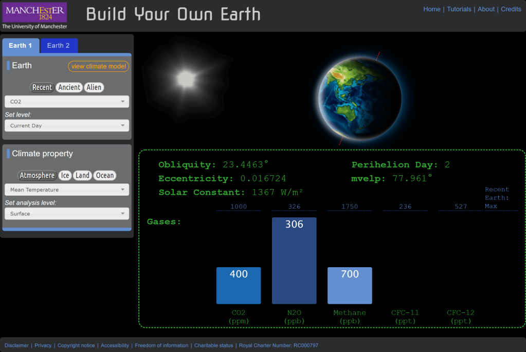 Ein Beispiel hierfür ist die Browser-basierte Lernsoftware Build Your Own Earth (2017) der University of Manchester, die es ihren Anwender:innen ermöglichen möchte, „das vergangene, gegenwärtige und zukünftige Klima der Erde zu erforschen“.16 Das augenfälligste Merkmal von Build Your Own Earth ist eine Animation des sich drehenden Planeten im Startbildschirm, dessen Oberfläche sich je nach Status der Simulation ändert. Darunter gibt es ein Balkendiagramm mit den Eigenschaften der Erdumlaufbahn und der Zusammensetzung der Atmosphäre. Zudem erhält man auf einer Karte eine animierte Darstellung der klimatischen Veränderungen im Jahreszyklus für die Atmosphäre, Eis- und Landflächen und den Ozean.